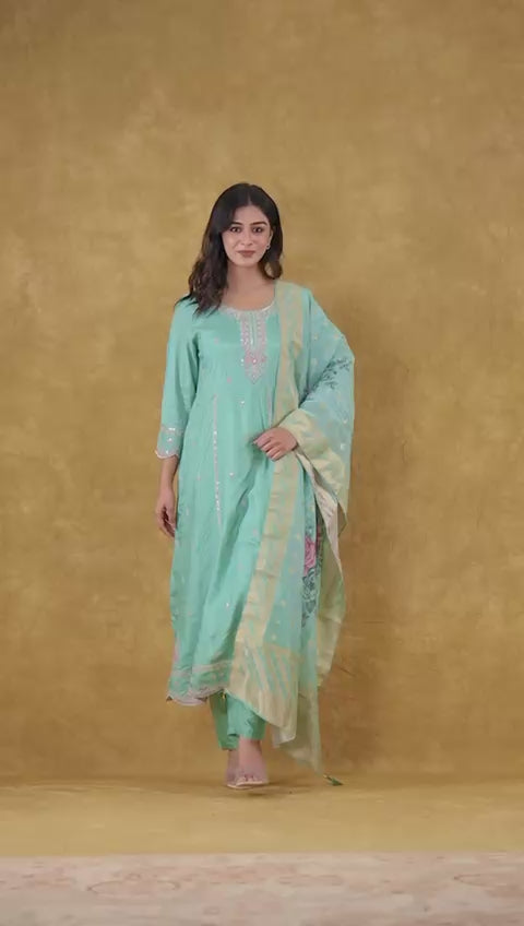 Elevate your style with our Anarkali Festive wear suit set. Made with pure muslin fabric, this set features intricate embroidery work, adding a touch of sophistication. Its soft green color adds elegance to any occasion. Kurta pant and dupatta included for a complete, stylish look.